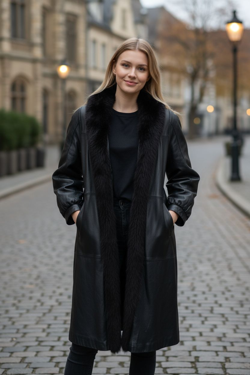 Women’s Black Leather Coat with Tuxedo Collar — a timeless classic that exudes elegance and sophistication. Crafted from supple, high-quality leather with a sleek silhouette and flattering fit. The tuxedo-style collar adds a touch of luxury and refinement, perfect for both day and evening wear.