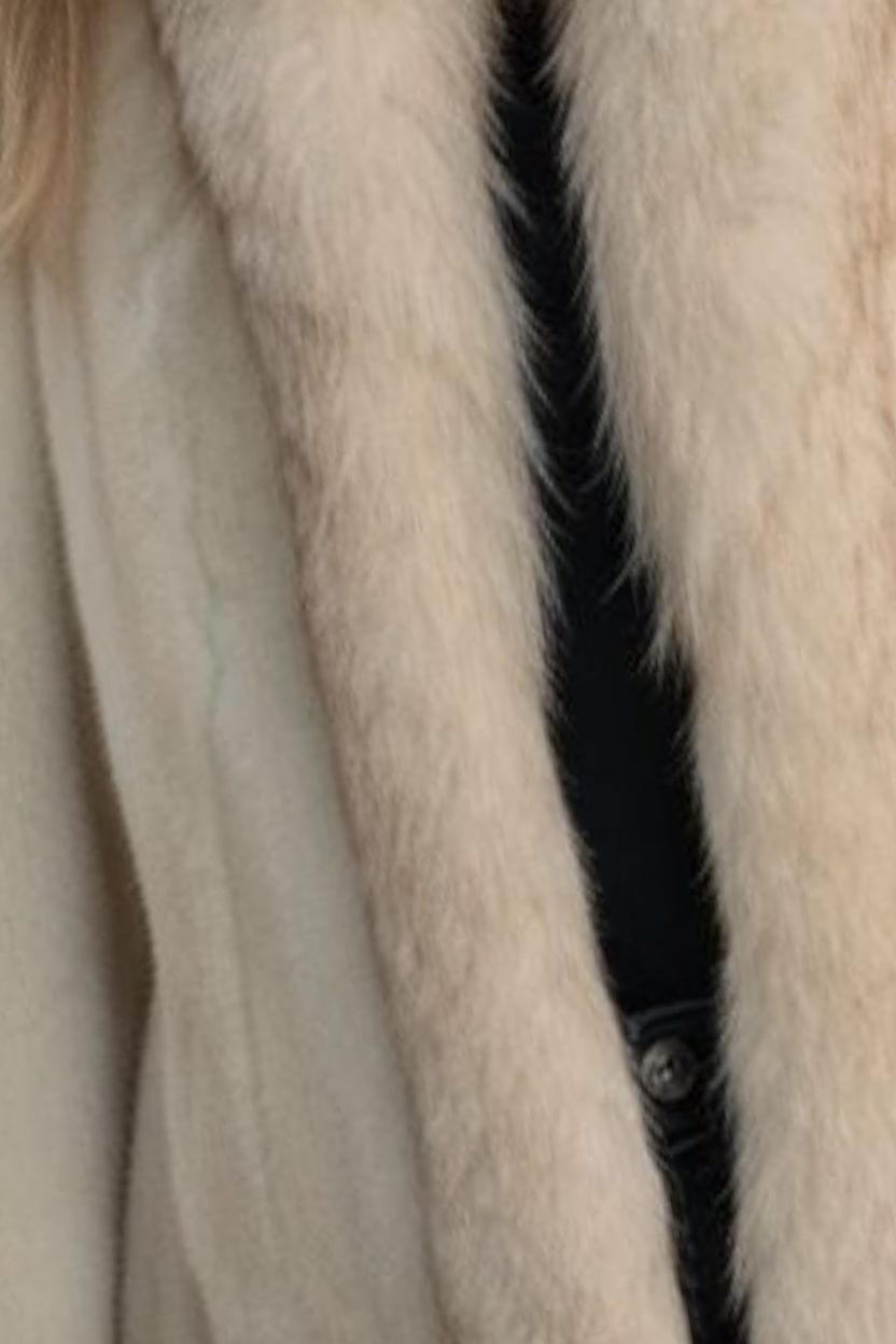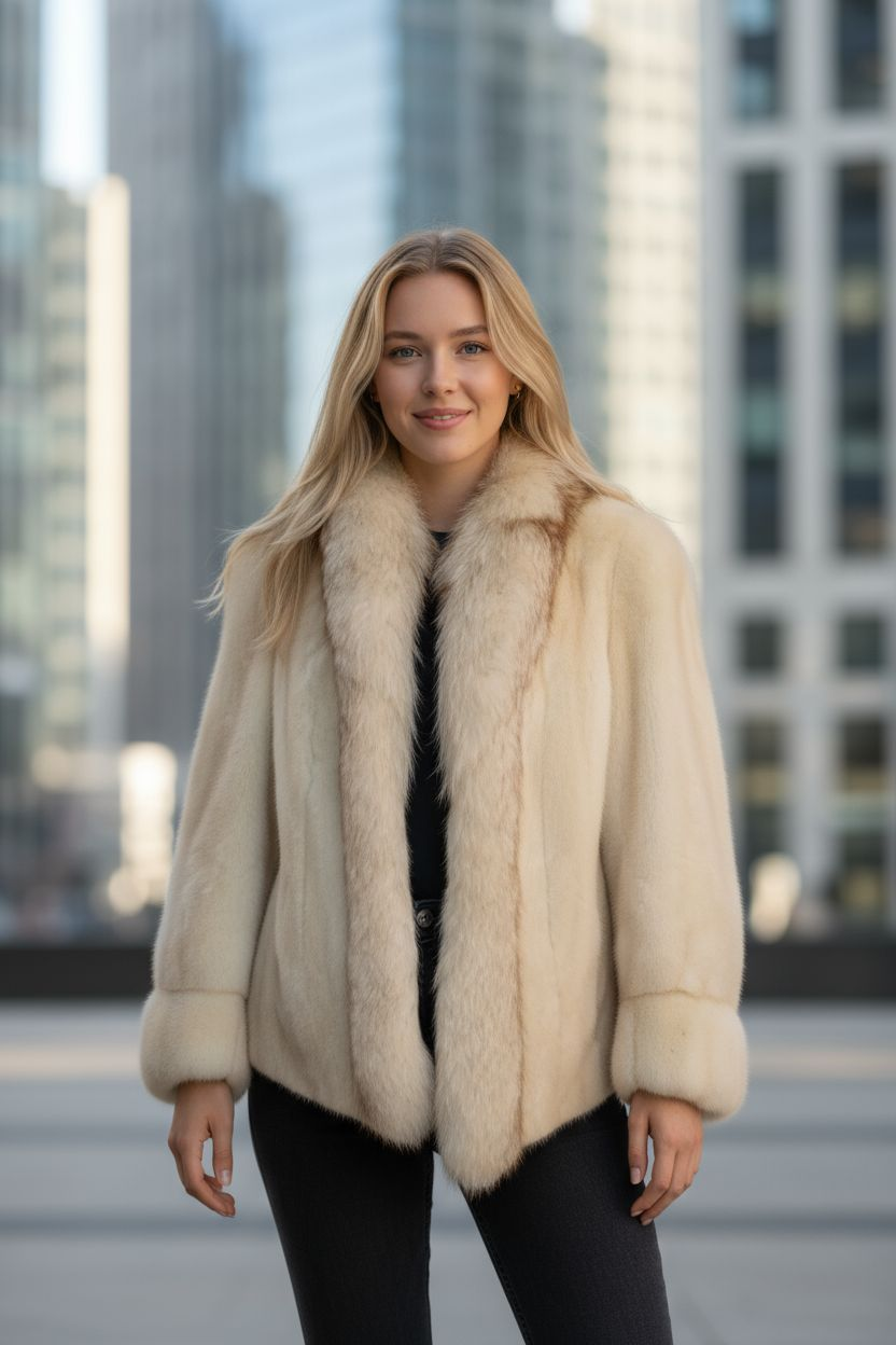 Step out in style with this exquisite white mink coat, featuring a sophisticated fox tuxedo collar. Perfect for adding a touch of timeless luxury to any wardrobe.